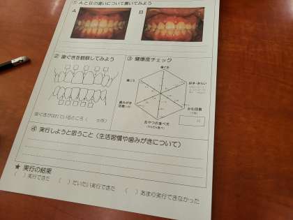 健康な口と歯周病の口を比べたり、自分の歯に歯垢がついてないかをチェックしたりして口内環境について考えました。