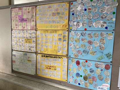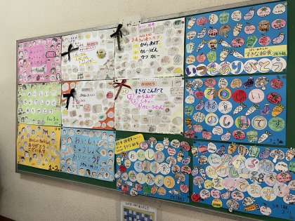 今週(24〜28日)は給食週間として、給食について考える期間を設定しています。給食の時間には、給食委員会の児童が給食に関する放送をしてくれています。給食室前には、給食を作ってくれている調理員さんへのメッセージが掲示してあります。