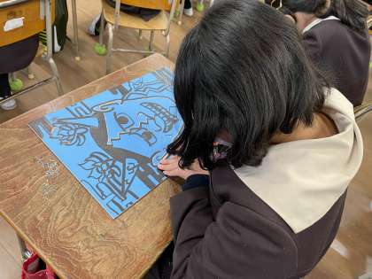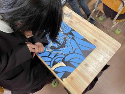 木版画で「鬼」を彫り始めました。「刀の向き」、「手を置く位置」などの安全面に気をつけてながら取り組んでいきます。