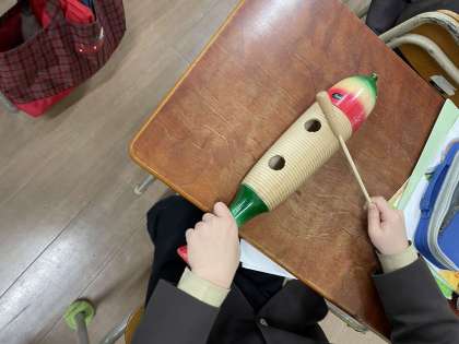音楽の学習で、いろいろな楽器を使っています。今回は、ギロとクラベスを使いました。リズムに合わせて、楽しく合奏することができました。