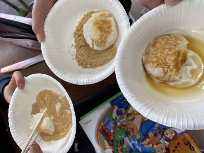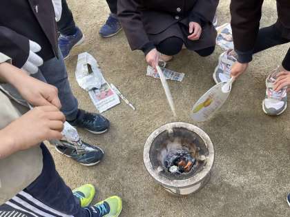 昔の道具について、社会で学習しています。その一環として、七輪を使っておもちを焼きました。子どもたちは、一生懸命うちわでおあいで火おこしを頑張りました!おもちはおいしかったかな?