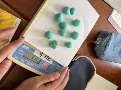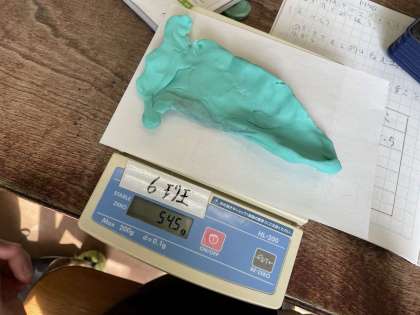 理科の学習で、ものの形をかえると重さはどうなるかについて調べました。へびの形やだんごの形・・・いろいろな形にかえて重さを測りました。