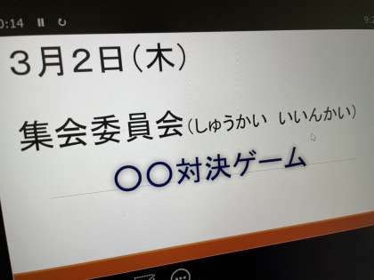今日の児童集会は「〇〇対決ゲーム」で、5・6年生でどちらが勝つかを予想するゲームでした。5・6年生の対決を楽しそうに視聴することができました。
