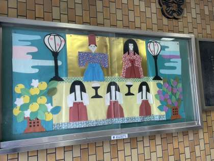 3月3日、今日はひなまつりです。玄関掲示もひなまつり仕様になっています。6年生は卒業まで残すところ2週間です。