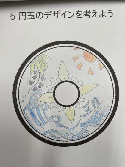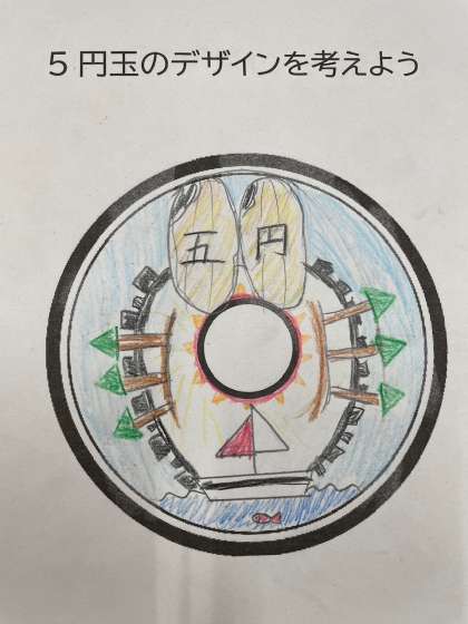 今の5円玉には、工業、農業、水産業、林業など、この一年で学習してきたことがすべて描かれていることを知りました。そこで自分なりの5円玉のデザインにチャレンジ!!日本の産業を盛り込んだ素敵なオリジナルデザインが仕上がりました!!