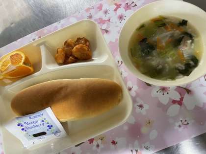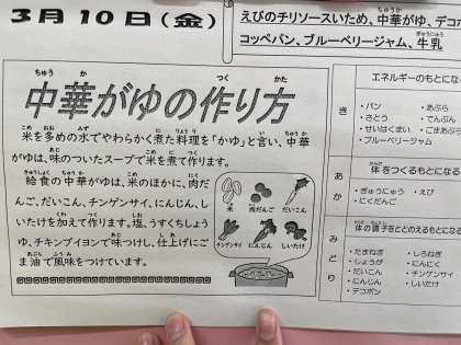 「中華がゆ」は肉だんごを使った児童に好評な献立です。だいこん、にんじん、しいたけ、彩りにチンゲンサイを使っています。ごま油を使用することで、中華らしさを出しています。