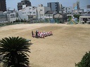 地震発生の際には、教室では机の下にもぐって身を守り、運動場にいた場合は中央にかたまって集まります。その後全員、運動場へ避難し安全を確認します。大津波警報が発令された後は、3階へ避難します。
