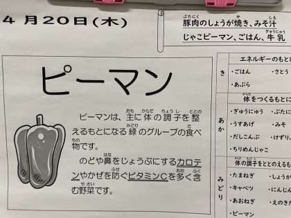 ピーマンは主に体の調子を整えるもとになる緑のグループの食べ物です。のどや鼻を丈夫にするカロテンや風邪を防ぐビタミンCを多く含む野菜です。