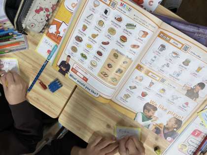 外国語の学習で、自分の名刺を書きました。自分の名前、好きなものをイラストでかき、名前のスペルの聞き方や好きなものの聞き方などの表現を使ってコミュニケーションをとりました。楽しく活動することができました。