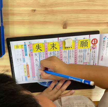 「走れ」の学習。気持ちを表す言葉を探しながら、登場人物の心情について意見交換をしています。 漢字の学習。トメ・ハネ・ハライに気を付けて丁寧に練習しています。