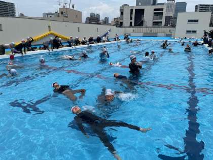 ペットボトルを活用し、長く浮いていられる練習をしています。