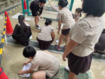 洗濯の学習で、ぞうきんに様々な汚れを付着させているところです。果たして汚れは落ちるのでしょうか。