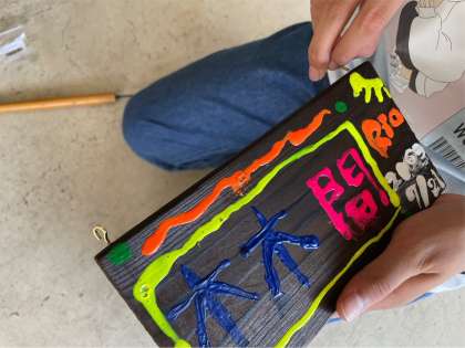 焼き板の金具をつけました。苦労しながらもチェーンをつけることができました。金具つけのあとは、みんなで遊びました。とても暑いです!