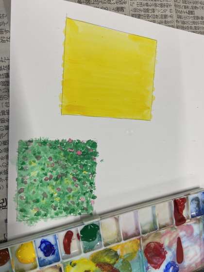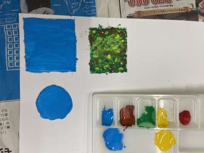 「山」をイメージして点々ぬりをしました。「黄色を先に塗ってみると、きれいな黄緑色になったー!」「赤の量で雰囲気が変わるな〜」など、色の配色の発見ができましたね!