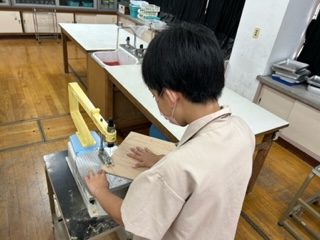 ? 5年生では電動糸のこを使って板を切り、伝言板を作る学習をしています。
