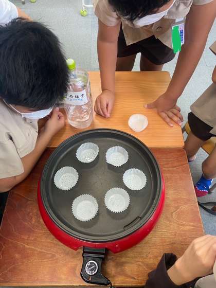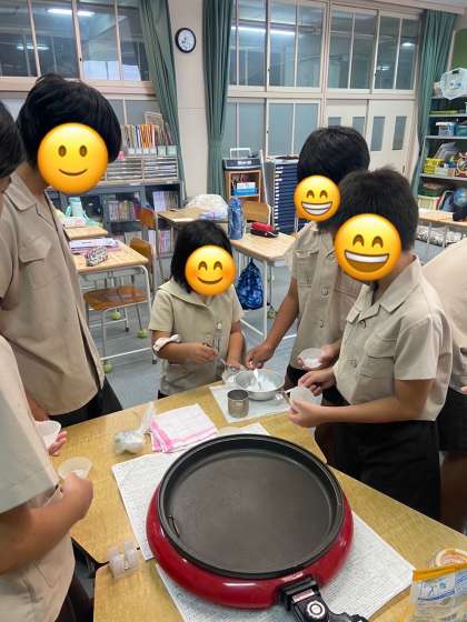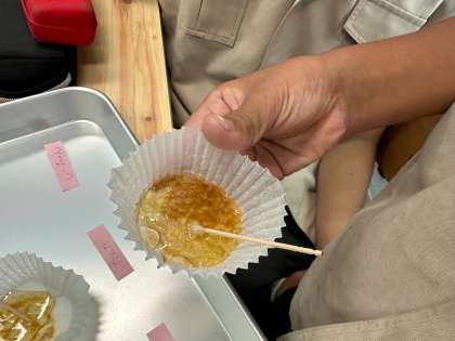 今日のこばとタイムは、べっこう飴作りをしました。砂糖液が、無色透明からうす茶色に変わっていく過程に興味津々!上級生が下級生に、あま〜い匂いを確かめさせる素敵な姿もありました。