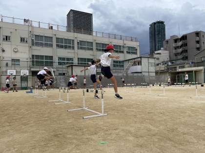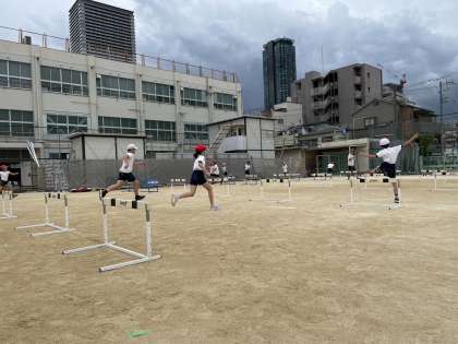 体育科の学習でハードル走を行っています。走るスピードをおとさずに、どのようにハードルを越えたらよいか考えながら練習に取り組んでいます。少しずつコツをつかんできたようです!