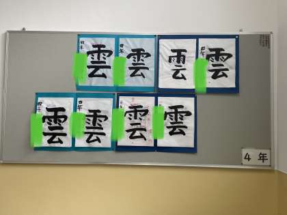 各クラスから、習字の「雲」の作品を掲示しています。ビフォー(左)・アフター(右)、上達しましたね!