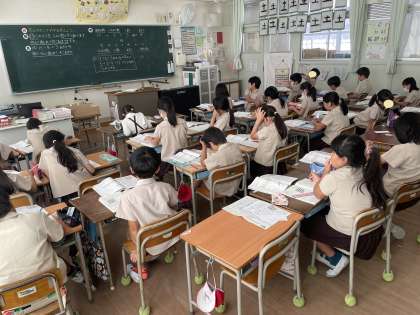 「全部の数」「人数」「一人分の数」「あまり」の4要素を並び替え、どのような計算をすると等式が成り立つか考えました。わり算の答えを確かめるときにはかけ算を使わなければいけないということに気付き、九九を確認しながら正確に求めることができました。