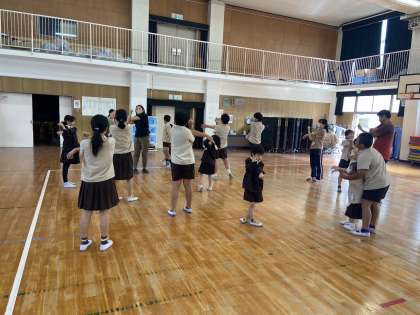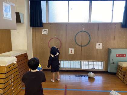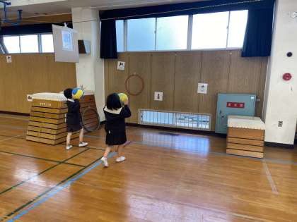 講堂でボール遊びをしました。キャッチボールでは、上級生が下級生に優しくボールを投げている思いやりの場面がありました。遠くにボールを投げるには…?上半身を反らせてみると、壁まで届くようになりましたね!