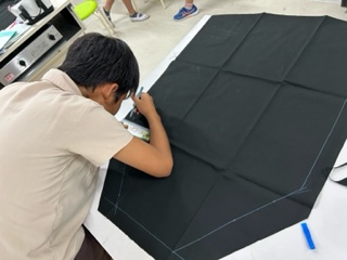 布の裏側に型紙を置いて、チャコ鉛筆でしるしをつけ、布をたちました。