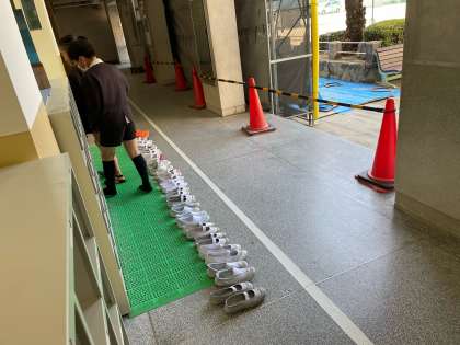 検査前には上靴ならべとあいさつ。
