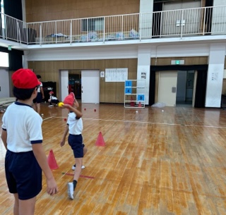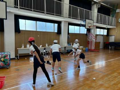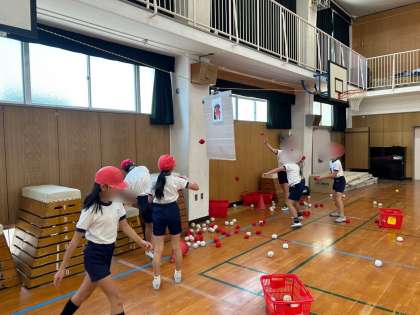 体育の時間を使って、様々なボール投げ運動に取り組んでいます。