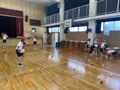 そして、チャレンジ・ザ・スロー。360°どこからでもシュートを打てるセストボール用ゴールも活用して、ボール投げ運動を楽しみました。