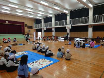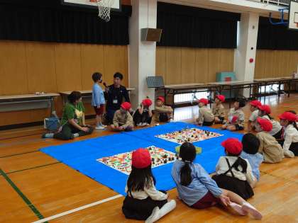 4つのがんばるポイント(かがやき、ひらめき、ほほえむ、たのしむ)を意識しての幼小交流。