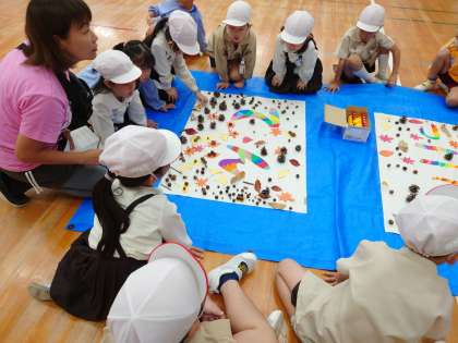 作品展に向けた飾りつけを、幼稚園きりん組さんと1年生とで取り組みました。
