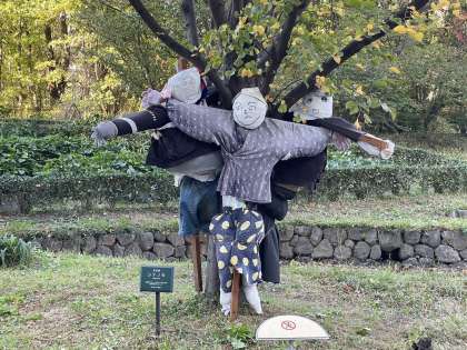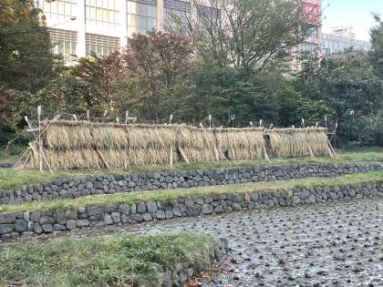 役目を終えたかかしが、天日干しされた稲を見守ってくれています。脱穀・もみすりを再来週に実施する予定です。