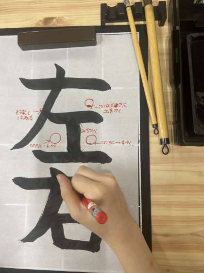 書写「左右」を毛筆書きしました。書き順と2つの字の大きさに気をつけました。習字3回目、筆を立てて書く意識が高まってきました。