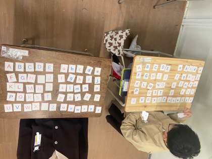 「大淀の町でアルファベットを見つけてこよう!」では、お店の看板に注目できていました。そして、「身近なものから小文字を見つけよう!」では、持ち物の文房具のメーカーやURL、また衣服のブランドなどから見つけ出すことができました!よく観察できました!