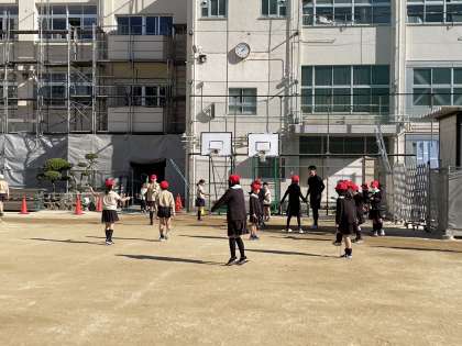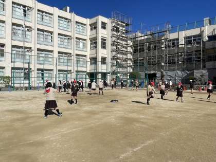 秋空の下、昼休みに日替わりでいくつかの学年がなわとびに取り組んでいます。なわとびの技術向上と寒さに負けない強い体づくりをめざしています。