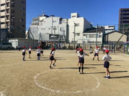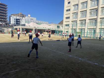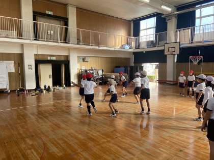 体育科で運動場ではアルティメット、講堂ではセストボールに励んでいます。チームプレイで大切なことは…を考えて試合に向けて練習しています。