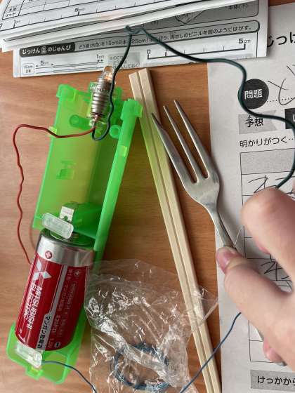 今回は、身の回りにあるいろいろな物と乾電池、豆電球を導線でつなぎ、豆電球が光ったかどうかを観察し、電気を通すグループと電気を通さないグループに分けました。