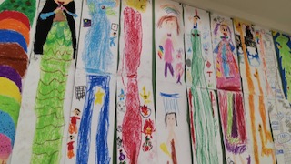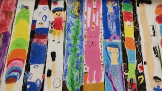 図画工作では、長〜い画用紙に絵を描きました。アイスクリーム、きょうりゅう、ロケットなど、それぞれ長〜いものを描きました。