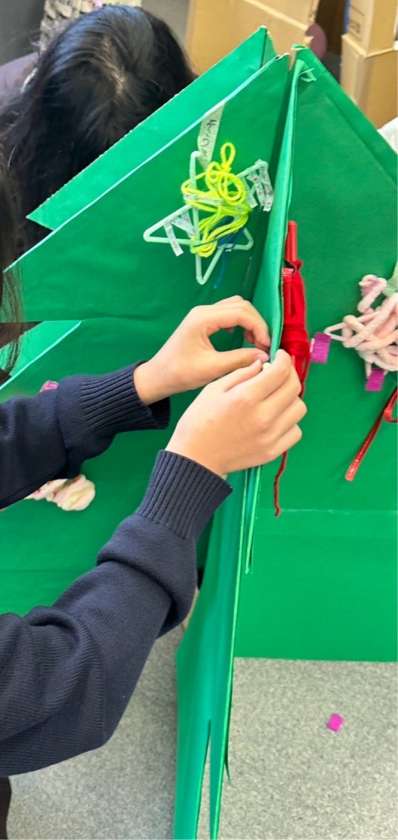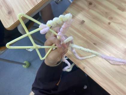 クリスマスオーナメント作りをしました。ストローを組み合わせて星形にして、毛糸を巻いて華やかな作品になりました。高学年がお隣の低学年を自然と手伝ってあげていて、すてきな時間でした。
