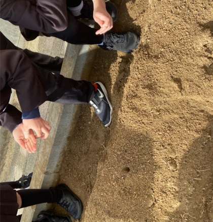 畝に指で穴を開けて、小さな小さな種を一粒ずつ丁寧に入れました。春が楽しみですね!