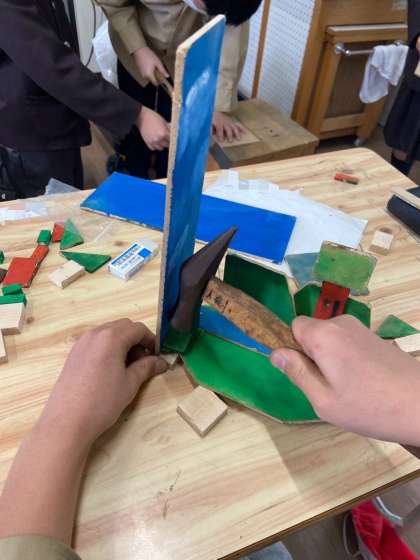 のこぎりで木をいろいろな形に切ったあとは、金づちで釘を打ちつけたり、ボンドで貼り付けたりして、工夫して作品作りをしています。