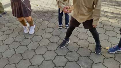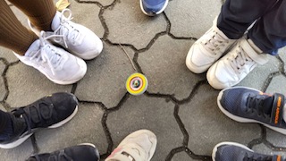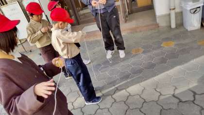 むかしあそびのこま回しをしました。「どうやってひもをまくの?」「小指でひもをはさんでもつねんで。」「〜さん、すごい!まわせた!」と子どもたちの会話もはずみました。なかなかむずかしい、こま回し。こま回し名人目指して、がんばれ!