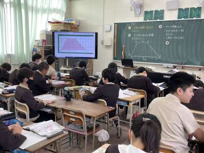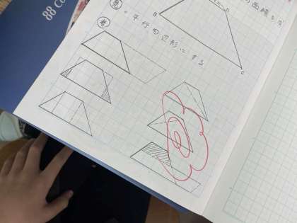 算数科の学習の様子です。台形の面積を求める方法について考えました。形を変えたり、つけたしたり、いろいろな方法で求めることができました。いろいろな方法で考えることは意外と難しいですね!