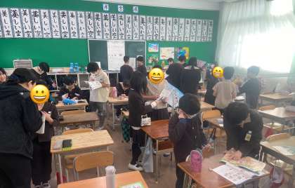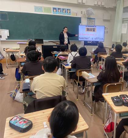 と英語で表現して、クラスのお友達とインタビューし合いました。自分の教室や図書室、運動場が人気でした!