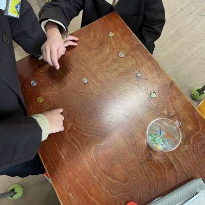 おはじき大好きっ子たちが、新ルール「チーム戦」のおはじきゲームを考えていました。