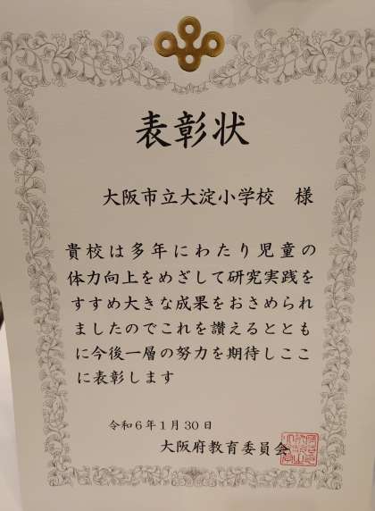 体力づくり・体力の向上に向けて、学校全体で研究や教育活動に取り組んだ結果、大阪市唯一の表彰校に選んでいただきました。