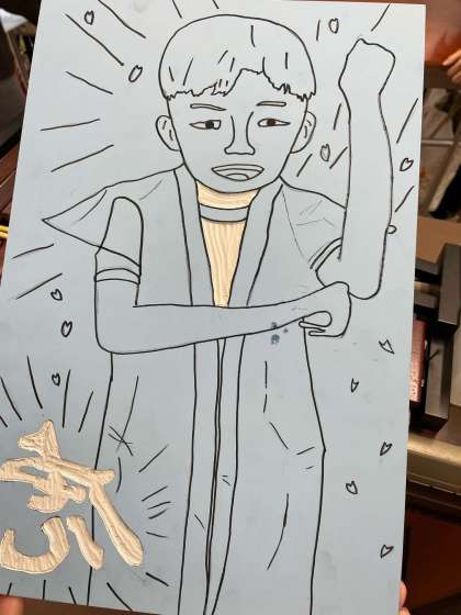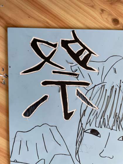 「ソーラン節」を踊る自分の姿を版画にしています。今日は文字を彫りました。