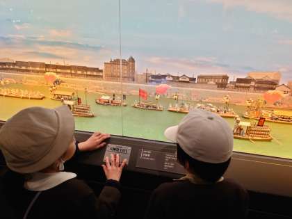 くらしの今昔館で、興味津々に学ぶ子どもたち。