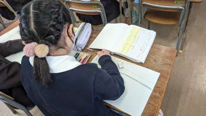 紹介したい人を決めて、紹介したい内容を付箋に書き、順番を考えて作文を書いています。