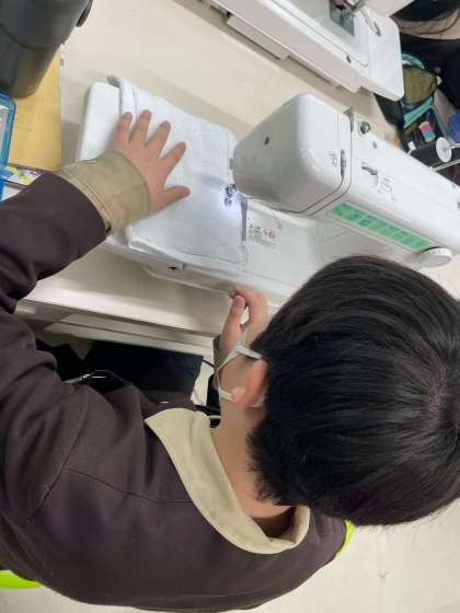 家庭科の学習でミシンを使ってあるものを製作をしています。縫い目が真っ直ぐになるよう丁寧に取り組んでいます。