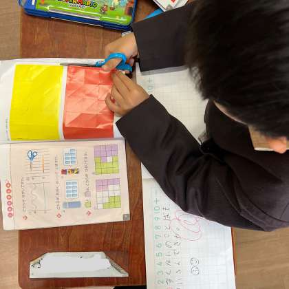 かたちのお勉強では、直角三角形の形を組み合わせて様々な形を作ります。